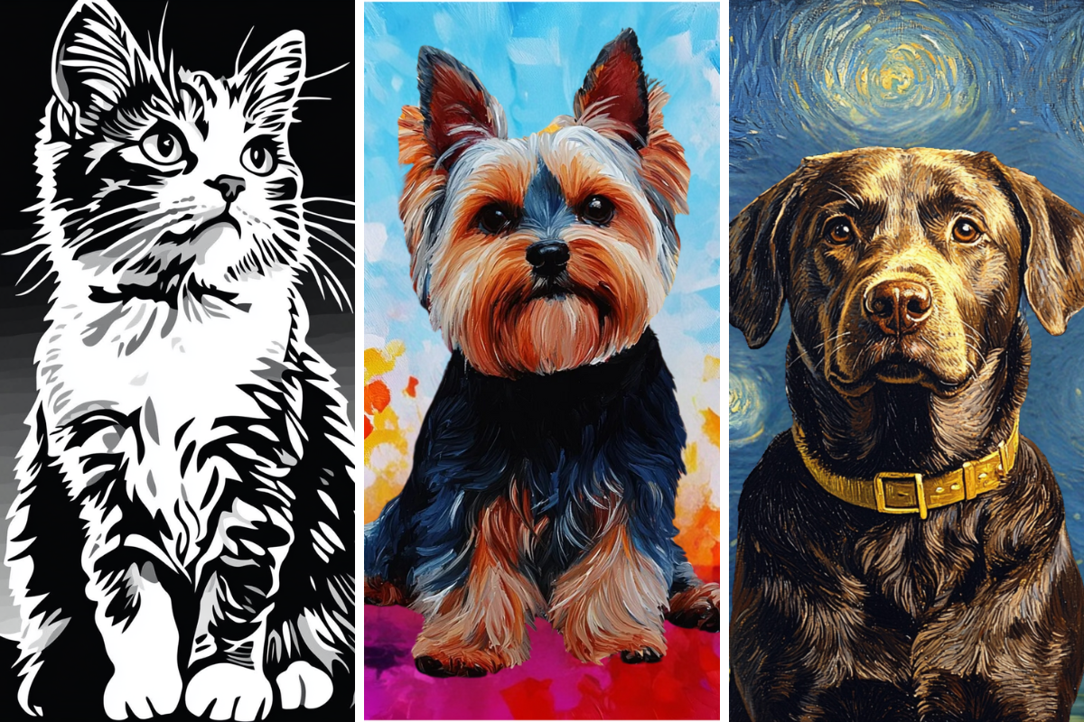 Start by selecting the art style that best matches your pet’s personality and your vision! We have a variety of styles to suit every taste. Explore our gallery, pick your favourite, and get ready to see your pet come to life in a one-of-a-kind artwork.